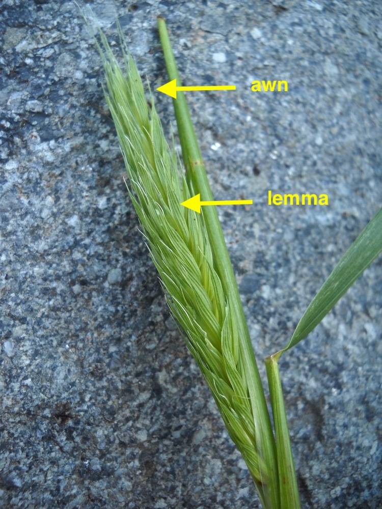 Each plant produces infertile and fertile shoots. The infertile shoots produce short leaves that persist throughout the growing seasons in a bunch at the base of the plant. The fertile shoots rise above the infertile leaves, and consist of multiple long leaves along an erect hollow stem that supports the flower spike. Each floret of the flower spike is protected by a lemma marked with dark green stripes and a long terminal bristle. After the florets are cross-pollinated by wind during a short one to two week period, the leaves of the fertile shoot wither away. Each successfully pollinated floret becomes a fruit in the form of a long grain.