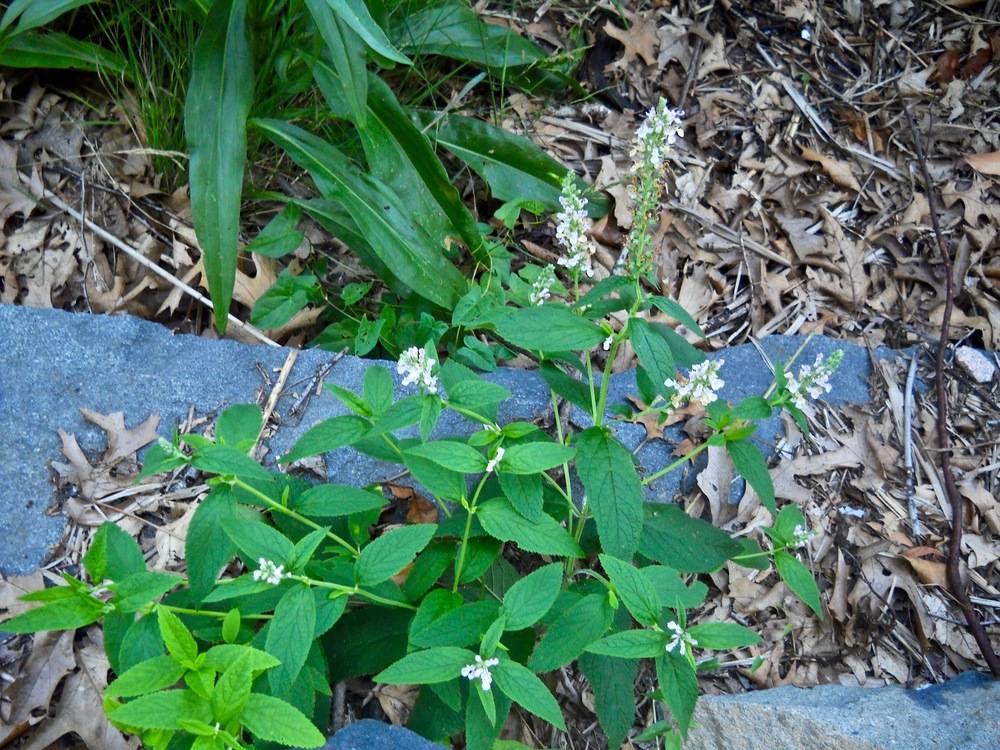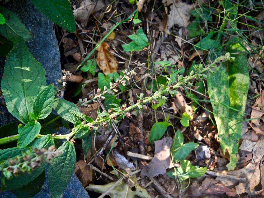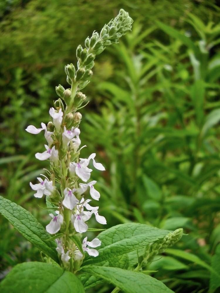 Like many other members of the mint family, it has a hollow erect stem that is squarish. In favorable habitats, it can establish itself quickly by sending out new stems from a dense mass of rhizomes, and thus is considered invasive in some areas. Because of its low-lying growth form, American germander is usually not very noticeable until its flower spikes appear. The flowers open successively from the base of the spike upwards, over the period of a month. For insect visitors such as bumblebees the large lower lip of the flower is a convenient landing platform.