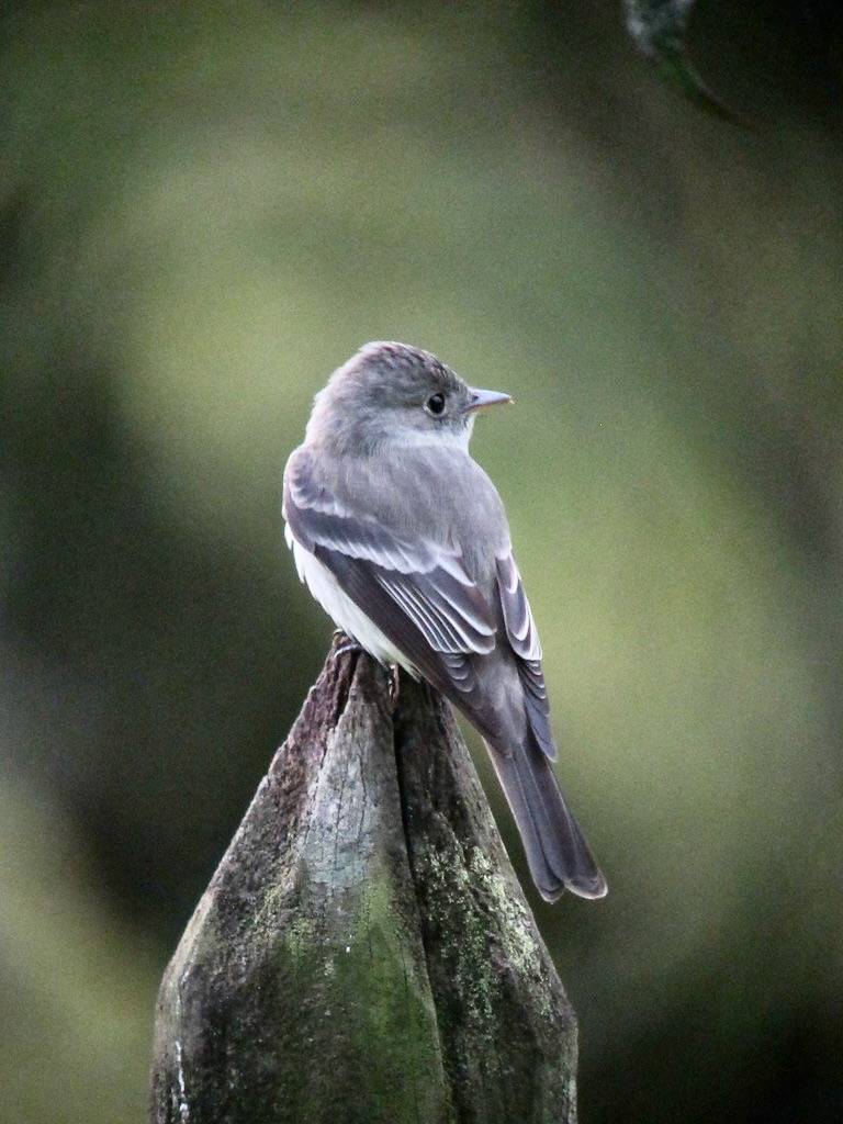 The Eastern Wood-Pewee might be confused with another visiting flycatcher to the park, the Eastern Phoebe. The Wood-Pewee has strictly gray upper parts with two light gray wingbars and clear white underparts. In contrast, the Eastern Phoebe does not have wingbars and is more brownish gray above, and pale but rather dingy below. Both flycatchers have a bill that is broad at the base but whereas the the Wood-Pewee has a lower bill that is yellowish, the Phoebe has a totally black bill. Additionally, the Phoebe will slowly wag its tail up and down while perched on a low-level branch.