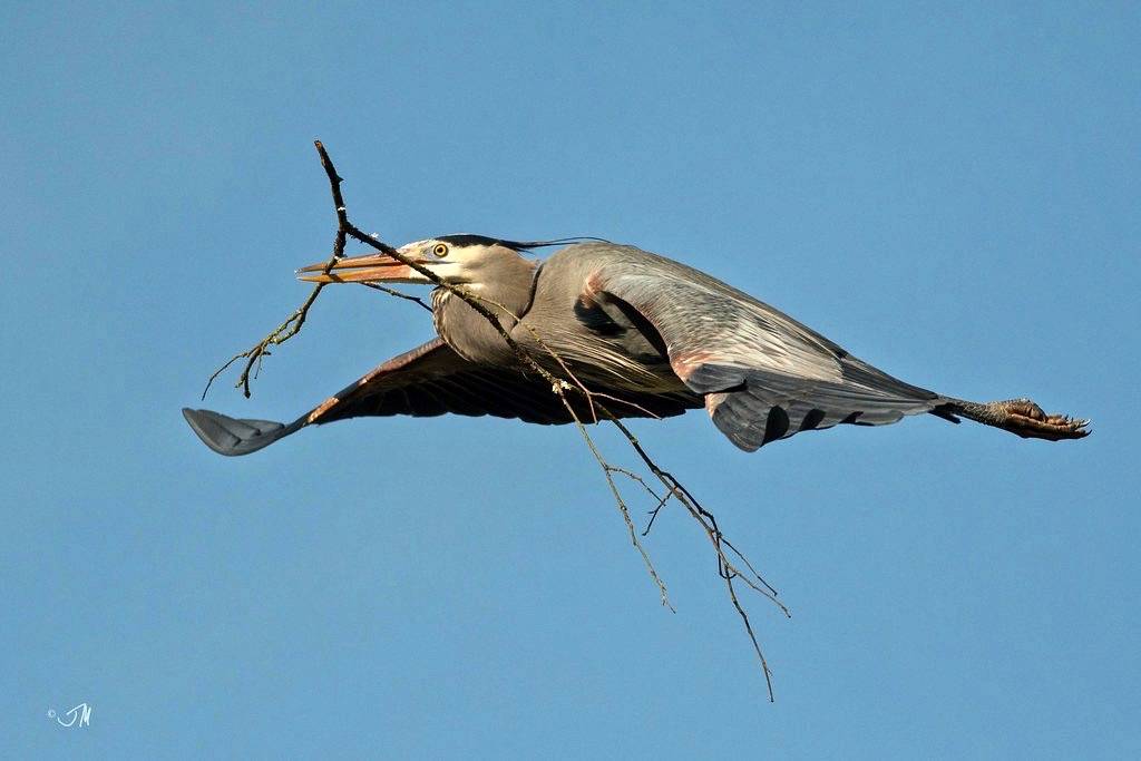 Although the Great Blue Heron breeds in large colonies, it is a solitary feeder whether foraging in wetlands or agricultural fields. It preys upon amphibians, crustaceans, fish, reptiles, rodents, and small species of waterbirds. Its partially webbed feet and long toes make it easier to walk on muddy bottoms without sinking. It has benefited from the recovery of beaver populations because their dam-building activity has increased wetland habitats to yield plentiful prey.