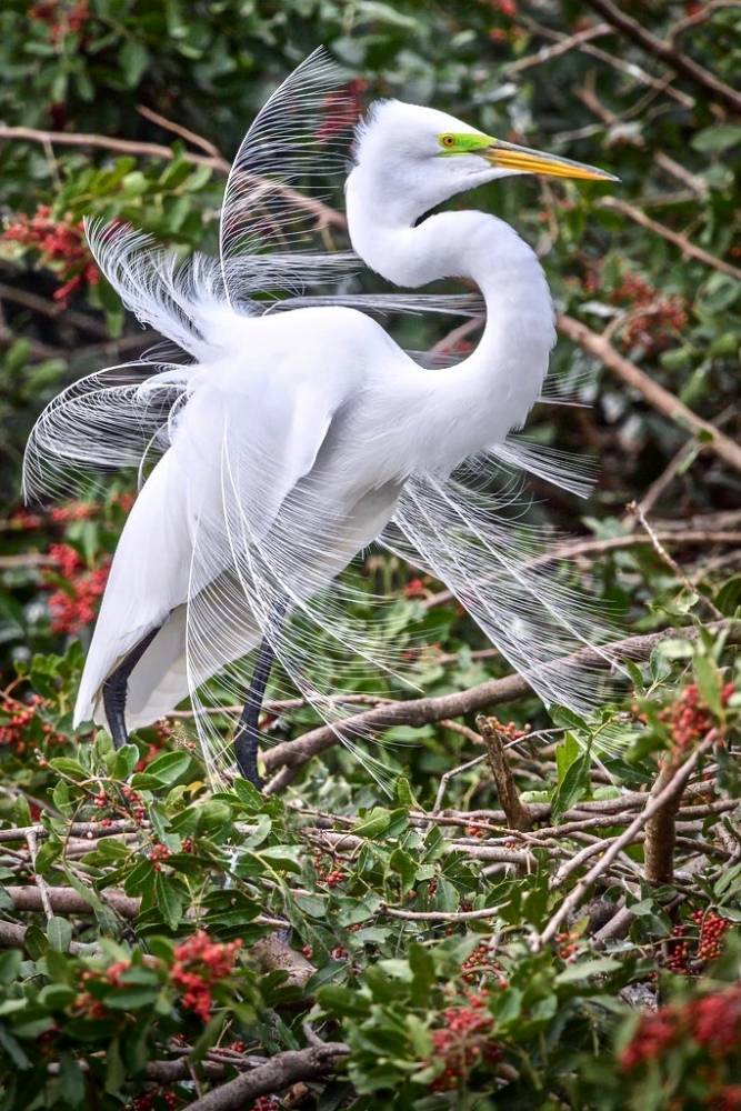 It was decimated nearly to extinction across North America in the late 19th Century along with other bird species endowed with plumes deemed fashionable for women's hats. Fittingly, the Great Egret is the symbol of the Audubon Society which was founded in part to prevent the killing of birds for their feathers.