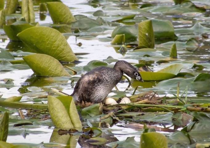 The Pied-billed Grebe is common and breeds in freshwater wetland areas with emergent vegetation across much of interior North America, Central America, the Caribbean, and South America. Its rarity at Salter Grove is not surprising because such habitat does not occur within the park.