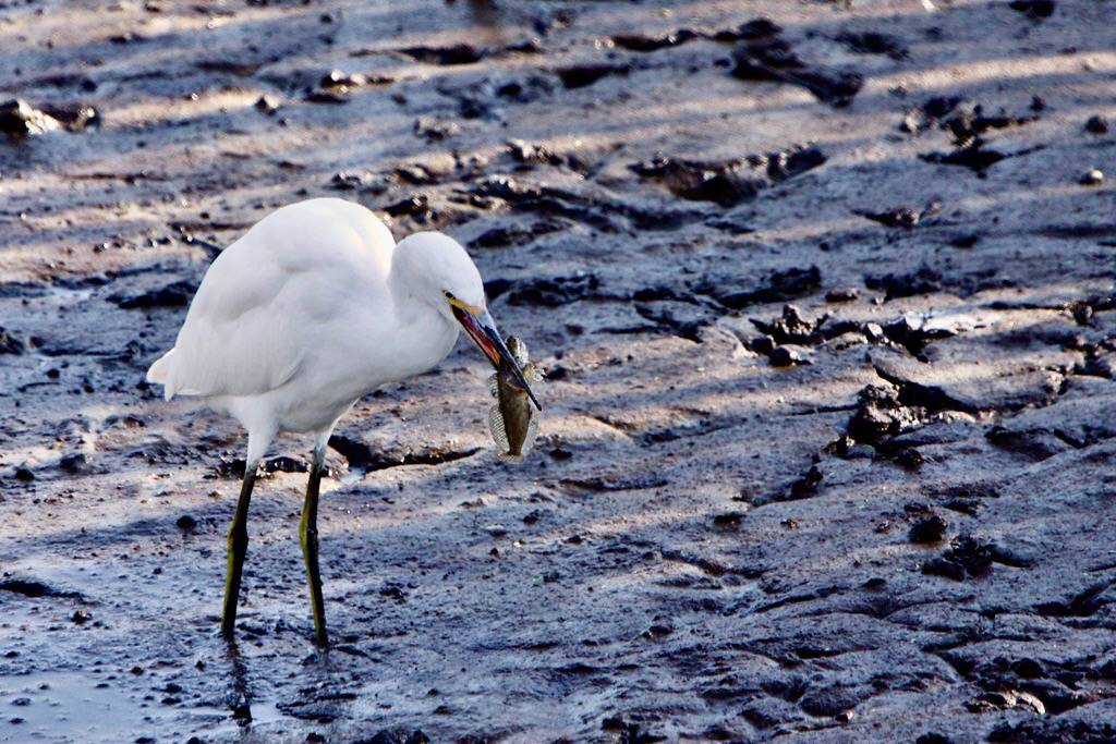 The Snowy Egret does not only sit and wait for fish like the Great Egret and Great Blue Heron. It uses its feet and other parts of its body to flush out prey before stabbing food items like crustaceans, fish, frogs, insects, and worms with its spear-like bill. Unlike the other egrets and herons which primarily feed while standing still, it will also feed while it is walking, running, or hopping. It will also hover with its feet just above the water to dip-fish.