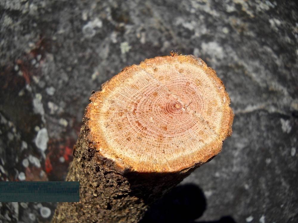 It is possible to estimate the age of a bittersweet from counting annual growth rings in a cross section of the stem, as is usually done for trees. The lighter rings represent wood growth in spring and early summer while the darker rings represent growth in late summer and fall. The 3" x 2.5" cross section shown above has 30 dark rings, suggesting an estimated age of 30 years.