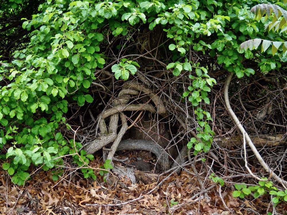 Large-diameter bittersweet stems are able to produce enough foliage to cover the entire crown of large trees. In some cases you will see how the weight of the climber has brought down large branches or even the main trunk of the host. After falling, bittersweet stems and foliage often grow into tall tangle mounds at ground level.