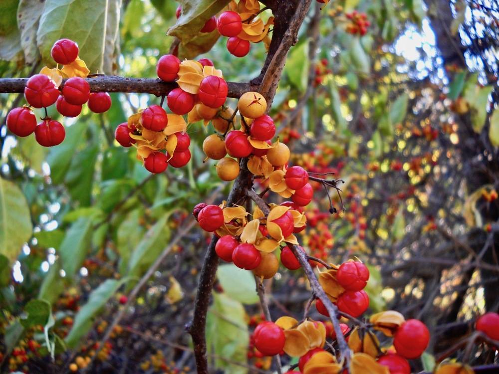 The Asian bittersweet is a perennial climber that is native to Japan, Korea and northeastern China. It was introduced to North America in 1860 for its ornamental berries, and has become much more abundant than the native American bittersweet. It favors edge habitats such as woodland openings, roadsides and fencerows, where light is plentiful and where vertical support is available for its upward climb. However, it can bide its time in the shady understory by sending out rhizomes to reach spots with more light.