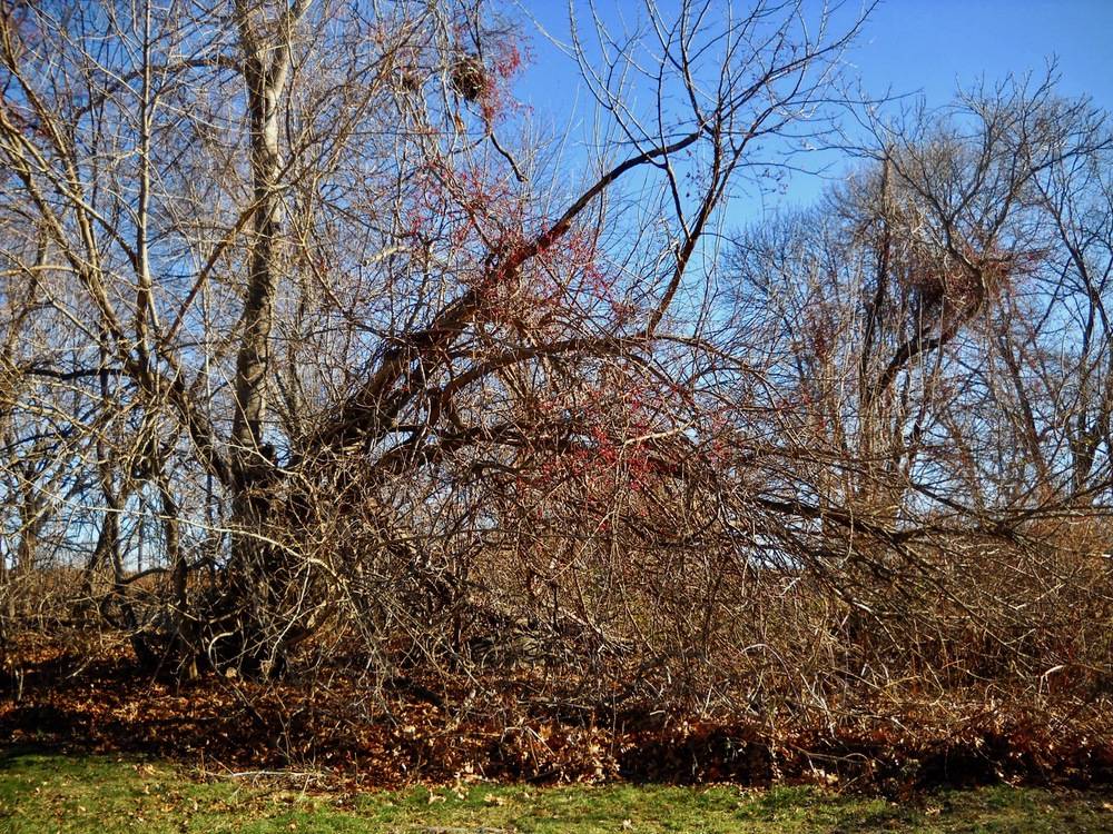If we were to compare abundance of woody plants at Salter Grove, the Asian bittersweet would clearly be the winner. It is the most successful of all the introduced species in the park. Stems of various sizes can be seen along all the trails of the park.