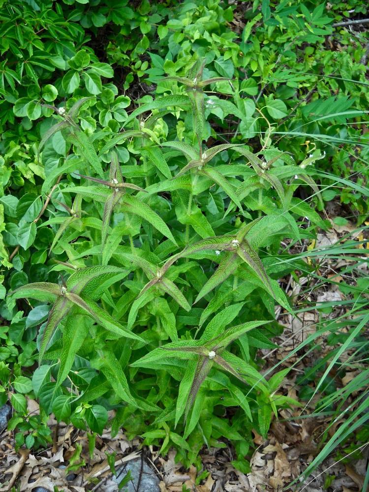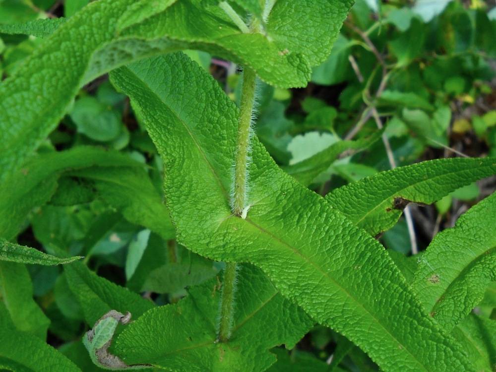 Very deeply set veins cause the long and narrow leaves to look wrinkled. Pairs of opposite leaves clasp the stem and appear to be fused into a single leaf pierced by the hairy stem. Its species name perfoliatum refers to this very illusion.