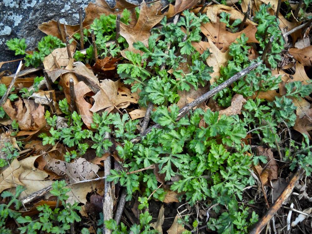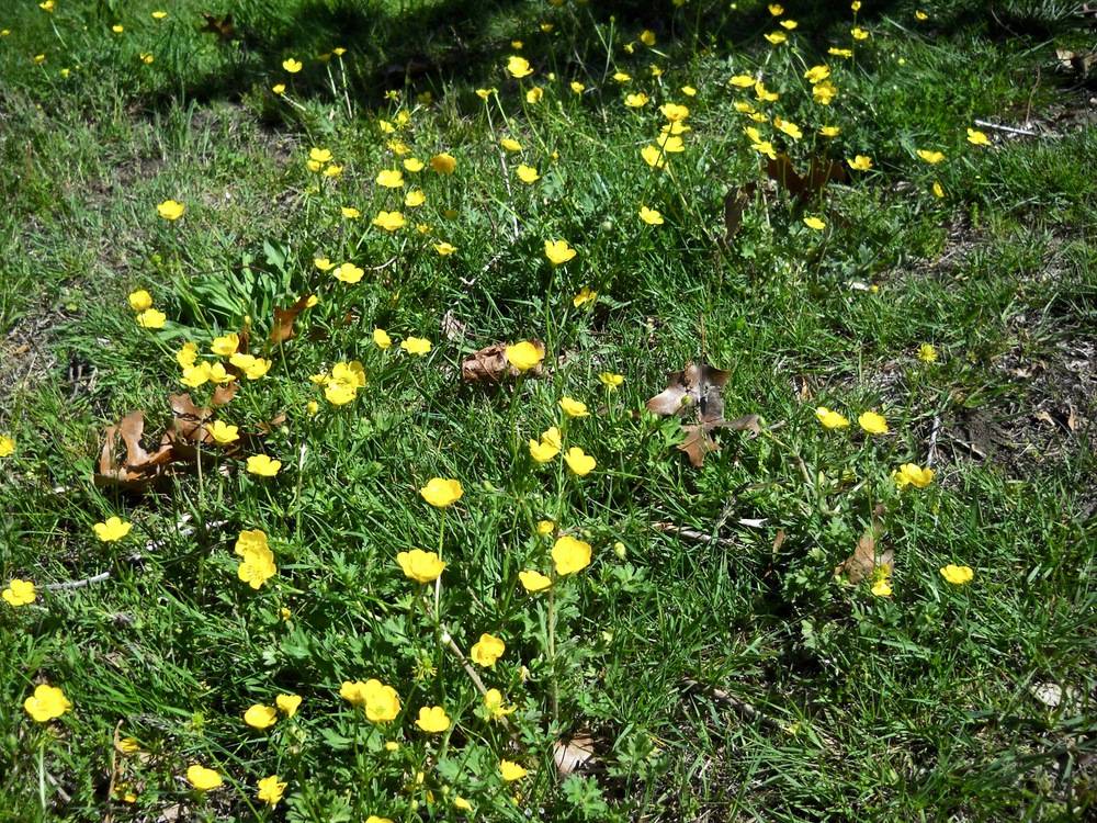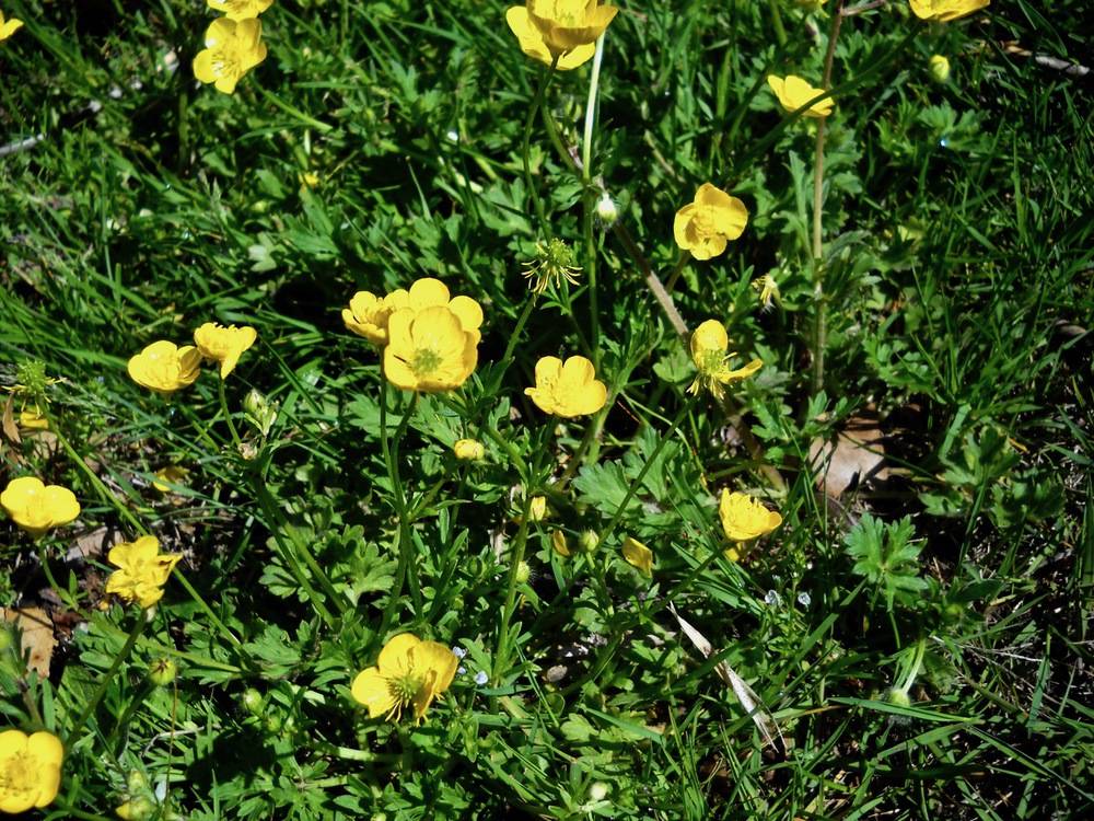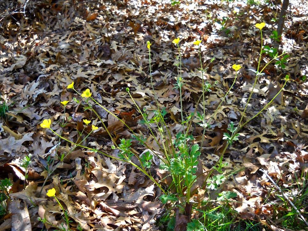 At Salter Grove, the bulbous crowfoot grows on the lawns east and south of the parking lot. It can be readily confused with the silver-leaved cinquefoil, which grows in much the same habitat and flowers at about the same time. Both have heavily dissected leaves that hug the ground, and both produce bright yellow flowers on short stems. However, unlike the cinquefoil, which drops its flower petals by early afternoon, the shiny yellow flowers of the crowfoot continue to brighten the lawn throughout the day.