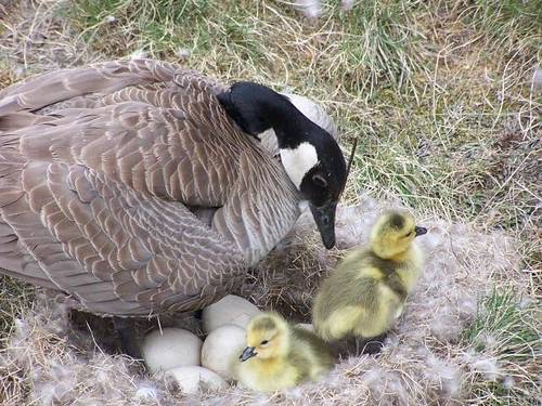 Pairs that are formed for life break away from their winter companions to establish a nest site each spring. The female selects the nest site and builds the nest and may lay 2-8 eggs. Only a few families with 2 to 5 goslings have been observed at Salter Grove during May and June in any one year, suggesting that suitable nesting habitat may be limited in the park.