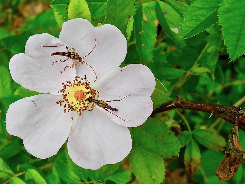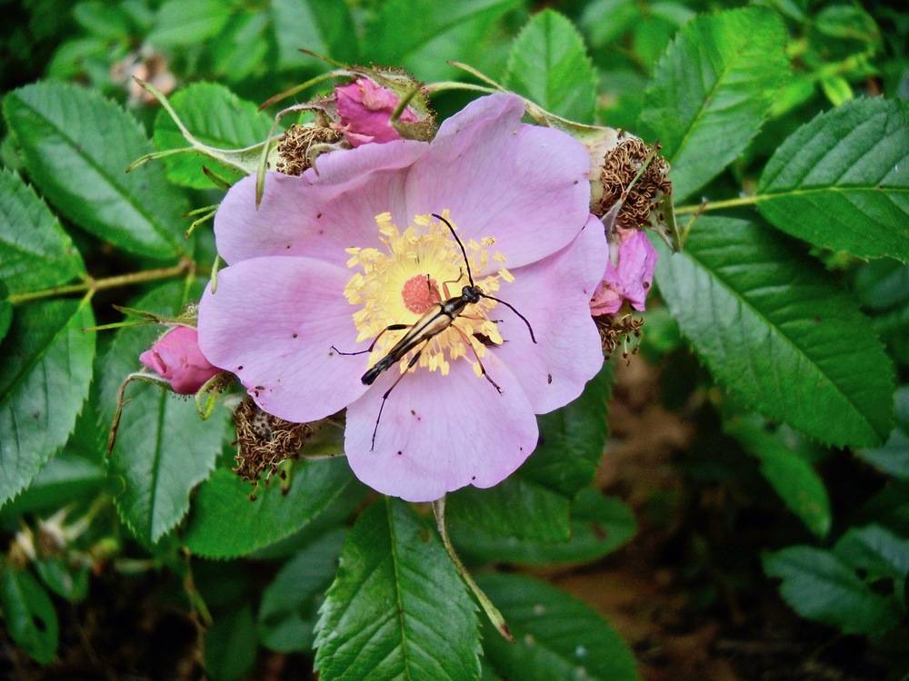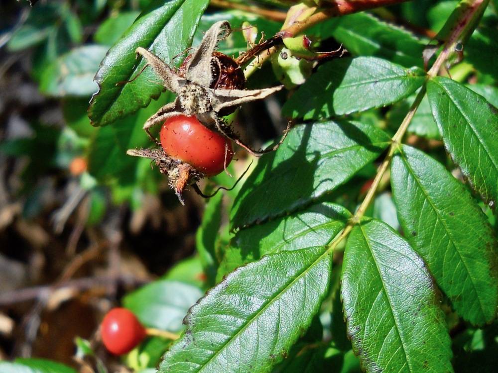 The fragrant pink flowers bloom for about a month starting in early June. They do not offer nectar but nonetheless attract various pollen-seeking insects, notably bumblebees and flower longhorn beetles (Strangalia famelica and Strangalia luteicornis). The bright red fruits, or rose hips, are a winter food for birds and small mammals. After the fleshy pulp is digested, the large seeds that remain are then defecated far from the parent plant.