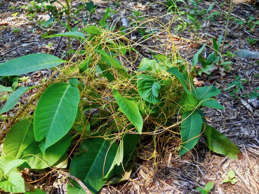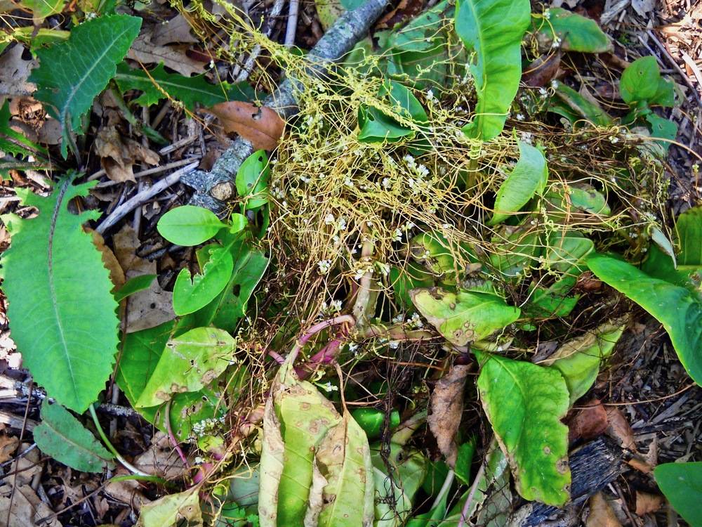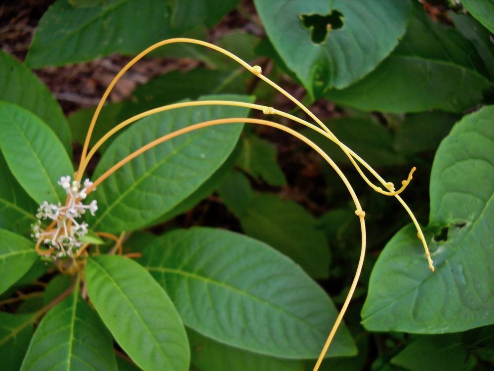 The common dodder is an annual climber that is a relative of the morning glory. It is an obligate parasite which means it takes everything it needs to grow and reproduce from another plant, often causing the demise of its host. It is native to most of North America, and is naturalized in Central Europe. Masses of its yellow to orange stems are most often draped over plants in sunny but moist habitats such as damp thickets, floodplains, roadsides, and swamps.