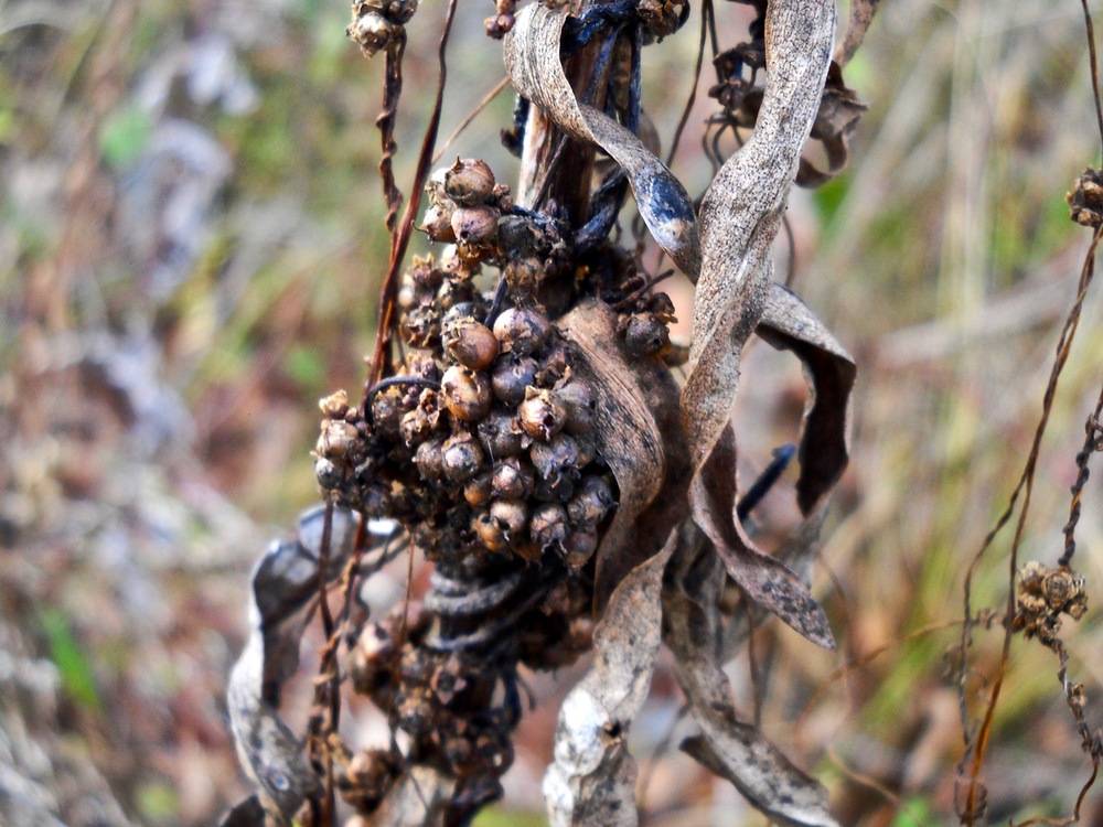 Dodder seedlings start with roots but dispense with them once the stem achieves a physical connection to a host plant. Small sections of the twining dodder stem develop into haustoria (or haustorium, when singular), projections that are capable of penetrating the host's phloem tissue to commandeer nutrients for its own use. As the dodder stems grow they continue to invade more host tissue and will even latch onto neighboring plants. Dodder leaves are present as barely visible scales on the stem, and although containing small amounts of chlorophyll, do not engage in photosynthesis much. The small white flowers are visited by wasps. The fruits develop as rounded yellow-to orange capsules, each containing four seeds. Once the seeds fall out of the capsule, the main agent of dispersal is by water.