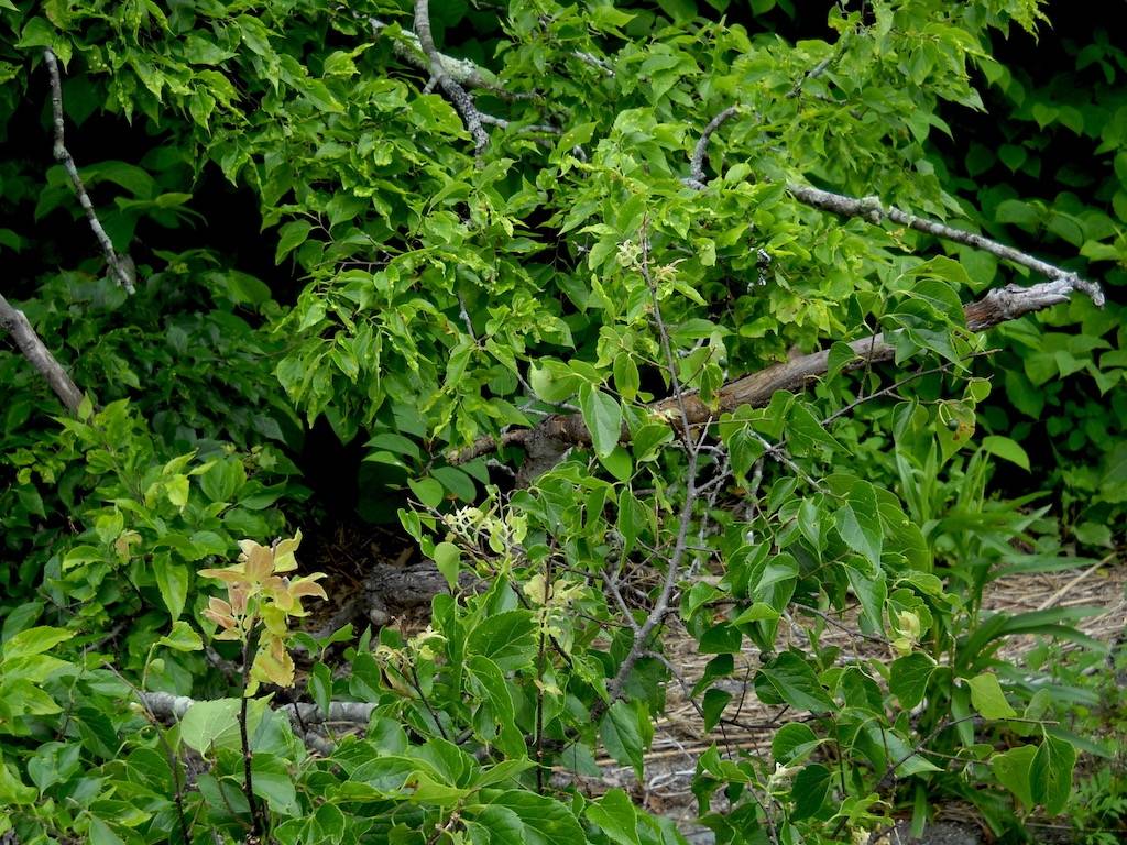 There are two rather large common hackberry trees not far from the parking lot at Salter Grove and both are recognizable by the warty bark even at a distance. Smaller individuals grow in the upland woods, along the marsh trail, and even among a grove of conifers in the middle of Audubon Field. They are likely to be the offspring of the two large individuals since many birds and small mammals feed on the small fruits of this species.