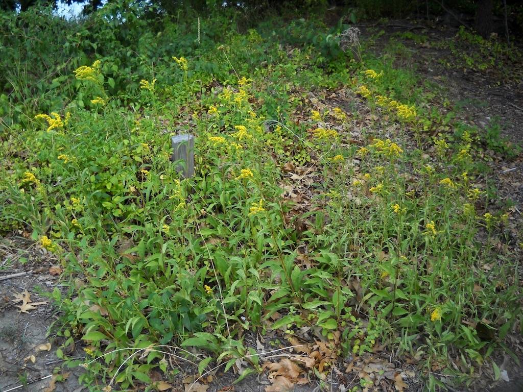 As suggested by its common name, the native perennial early goldenrod is the first goldenrod species to flower at Salter Grove. It is easy to distinguish from the others even when all goldenrods are flowering because it tends to be shorter and characteristically has leaves growing at its base. There is a healthy patch of this species along the Upland Trail near marker U9.