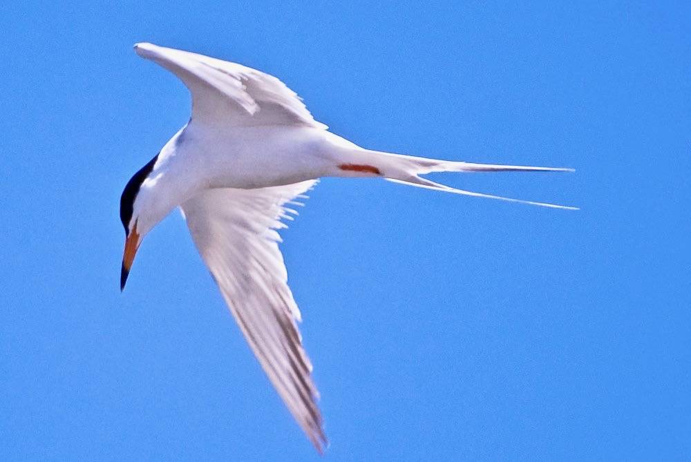 It can be distinguished from the similar but slightly smaller Common Tern by the following. Whereas the Common Tern has a white forehead and black on the back of its head, Forster's Tern has a black eyepatch on a white head. The Common Tern has a bit of black in its wing, Forster's tern does not. And finally, the Common Tern also has a forked tail but Forster's tern has a tail that forms a deep V when fully spread because of two very long outer tail feathers.