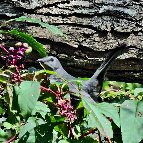 The Gray Catbird arrives in mid-April to breed in the understory of the park and builds its stick nest in thick tangles of vegetation, often incorporating pieces of plastic. It forages for insects and spiders on the ground with its beak. It readily adds fruits and berries from both native (American holly, American pokeweed) and introduced (Asian bittersweet, white mulberry) plant species to its diet while breeding and in migration.