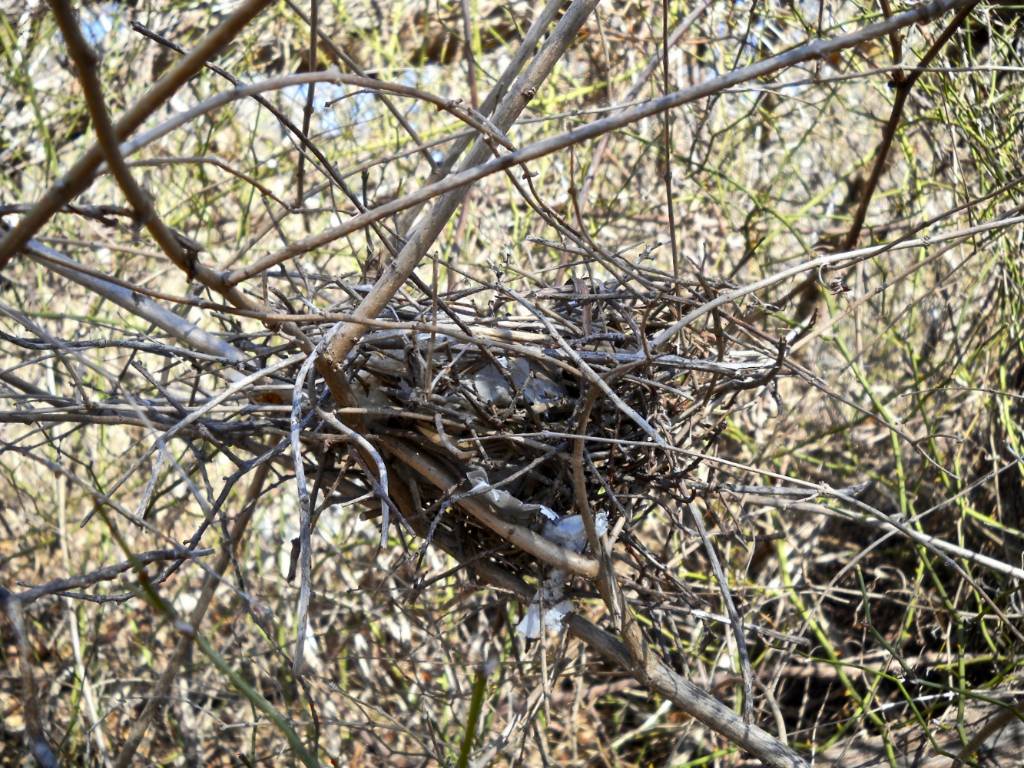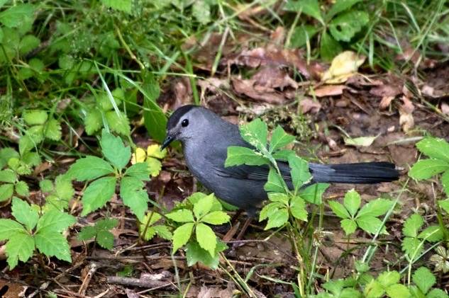 The Gray Catbird arrives in mid-April to breed in the understory of the park and builds its stick nest in thick tangles of vegetation, often incorporating pieces of plastic. It forages for insects and spiders on the ground with its beak. It readily adds fruits and berries from both native (American holly, American pokeweed) and introduced (Asian bittersweet, white mulberry) plant species to its diet while breeding and in migration.