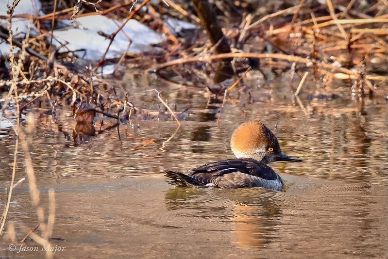 Like several other cavity-nesting ducks such as the Common Goldeneye, Common Merganser, and Wood Duck, the Hooded Merganser is a brood parasite. The female will lay eggs in the nest cavity of other ducks, but of course, it gets parasitized in turn. Its maximum clutch is known to be 13 eggs but as many as 44 eggs have been found in a Hooded Merganser nest. Nests with so many eggs are often abandoned.