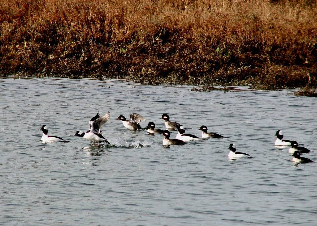The Hooded Merganser is a regular winter resident at Salter Grove and can be seen from the causeway or along the Marsh Trail from November through March. Small flocks fly frequently between the Providence River, and North and South Coves. It dives ceaselessly for small fish, and it is rare that all members of a raft can be seen above water at the same time. It is smaller than both the Common Merganser and Red-breasted Merganser, two other mergansers documented for the park.