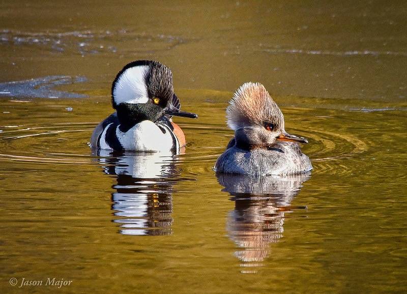 Like several other cavity-nesting ducks such as the Common Goldeneye, Common Merganser, and Wood Duck, the Hooded Merganser is a brood parasite. The female will lay eggs in the nest cavity of other ducks, but of course, it gets parasitized in turn. Its maximum clutch is known to be 13 eggs but as many as 44 eggs have been found in a Hooded Merganser nest. Nests with so many eggs are often abandoned.