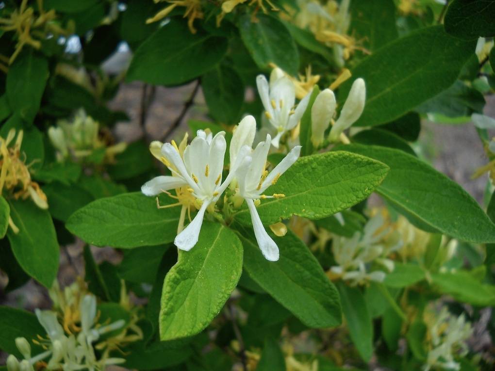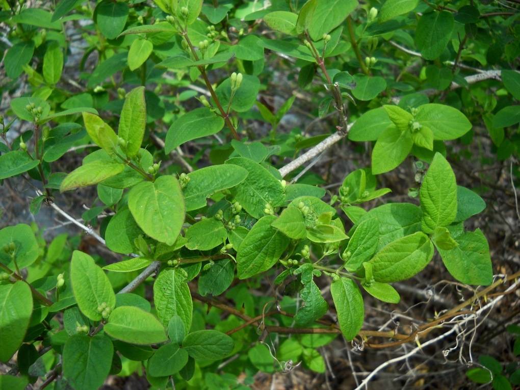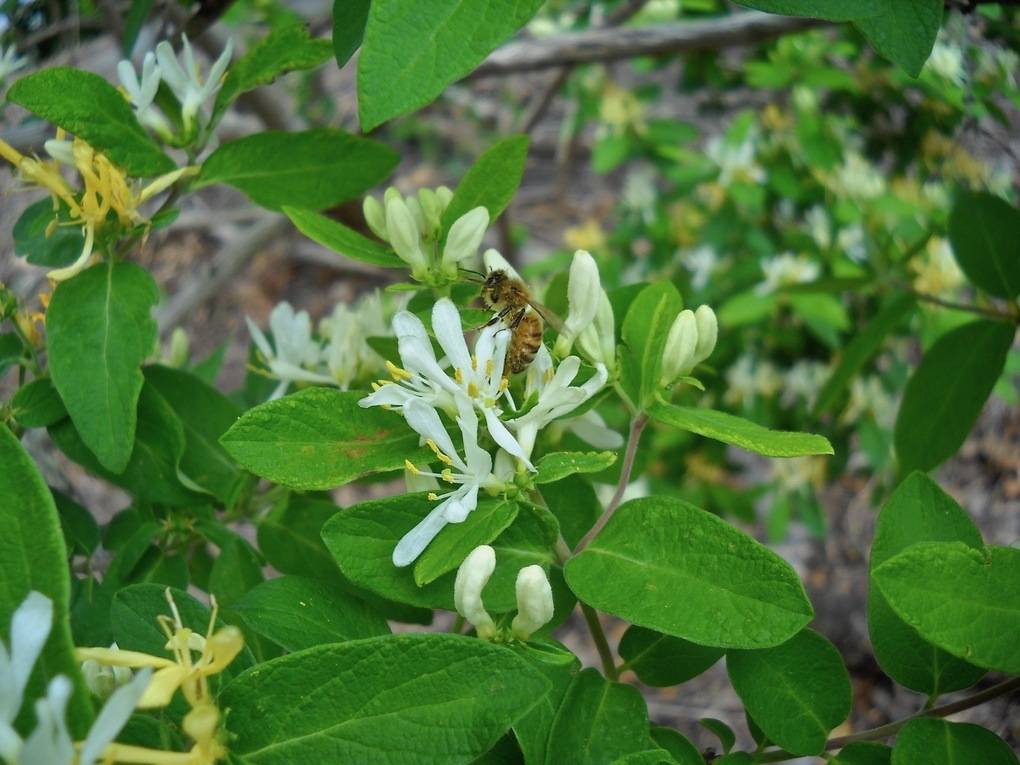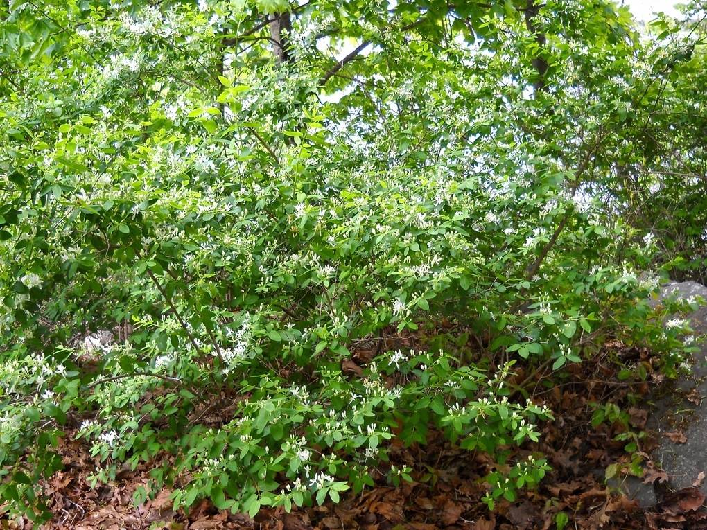 Unlike the native climbing honeysuckles, Morrow's honeysuckle is a shrub. Native to northeastern China, Japan and Korea, it has adapted so well in some areas of temperate North America that it is considered to be an invasive species. It seems to grow best in disturbed woodland with young trees. Apart from shading out ground plants, it is thought that Morrow's honeysuckle has an allelopathic effect on other plants thus inhibiting the regeneration of native species in disturbed areas.