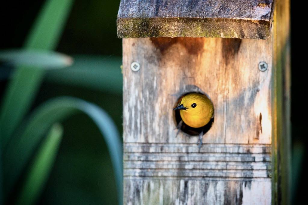 Unlike other warblers of the Northeast, the Prothonotary Warbler prefers to nest in holes of standing dead trees. It favors the old nests of Black-capped Chickadees and Downy Woodpeckers if not chased away by competing House Wrens. Its willingness to use man-made nest boxes has made it possible to maintain breeding populations where numbers had declined due to habitat loss, especially in southern United States.