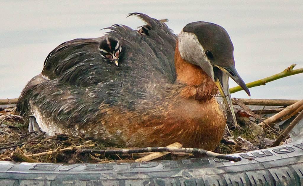 Like all grebes, the Red-necked Grebe has lobed feet which are set far back on its body. While good for propulsion underwater, this posterior placement results in awkward movement on land. It also shares the habit of eating large amounts of its own feathers, a behavior that likely protects the soft intestines from the sharp fish bones and crustacean shells ingested. (Checkout the amazing images of feather plug regurgitation in the Pied-billed Grebe species account.) Parents feed both feathers and fish to chicks and will carry and shelter juveniles on their backs for days until they can swim independently.