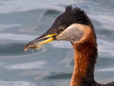 Like all grebes, the Red-necked Grebe has lobed feet which are set far back on its body. While good for propulsion underwater, this posterior placement results in awkward movement on land. It also shares the habit of eating large amounts of its own feathers, a behavior that likely protects the soft intestines from the sharp fish bones and crustacean shells ingested. (Checkout the amazing images of feather plug regurgitation in the Pied-billed Grebe species account.) Parents feed both feathers and fish to chicks and will carry and shelter juveniles on their backs for days until they can swim independently.