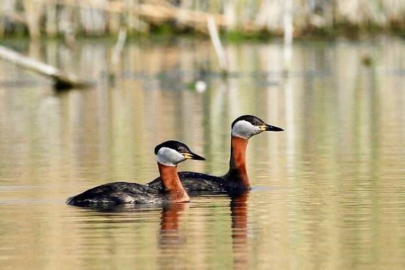 The Red-necked Grebe is the largest of three grebes that migrate through Salter Grove, followed by the Horned Grebe, with the Pied-billed Grebe being the smallest. However, size comparisons would not be helpful in their identification because they usually occur as singletons and are usually seen at a distance. More helpful would be their differences in plumage color, and beak and body shape. The Pied-billed Grebe has a chicken-like beak and blocky body. The Horned Grebe has a well-defined white cheek and neck and a relatively shorter beak.