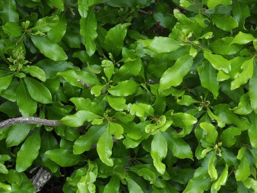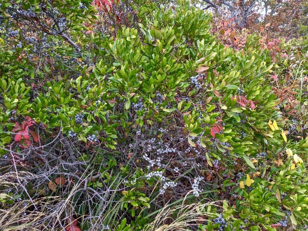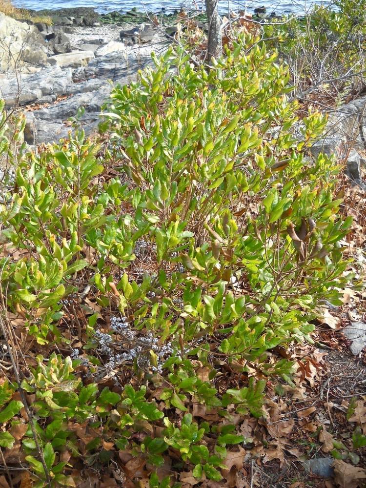 At Salter Grove, it is found in the dry upland woods, along the marsh above high tide, and on the exposed rock outcrops of Rock Island. Plants growing in the shadier environment of the upland woods have larger and softer leaves. Plants that are more fully exposed to sun and wind in the latter two habitats produce narrower and leathery leaves.