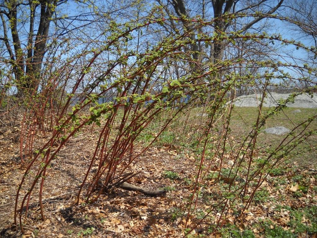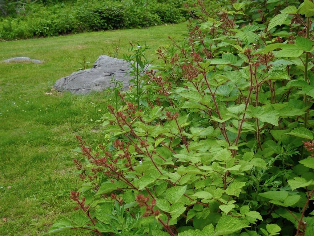At Salter Grove, a few clumps of wine raspberry stems can be found here and there within the upland woods, but it is most successful on the lawn south of the parking lot where it has formed a dense monospecific thicket.