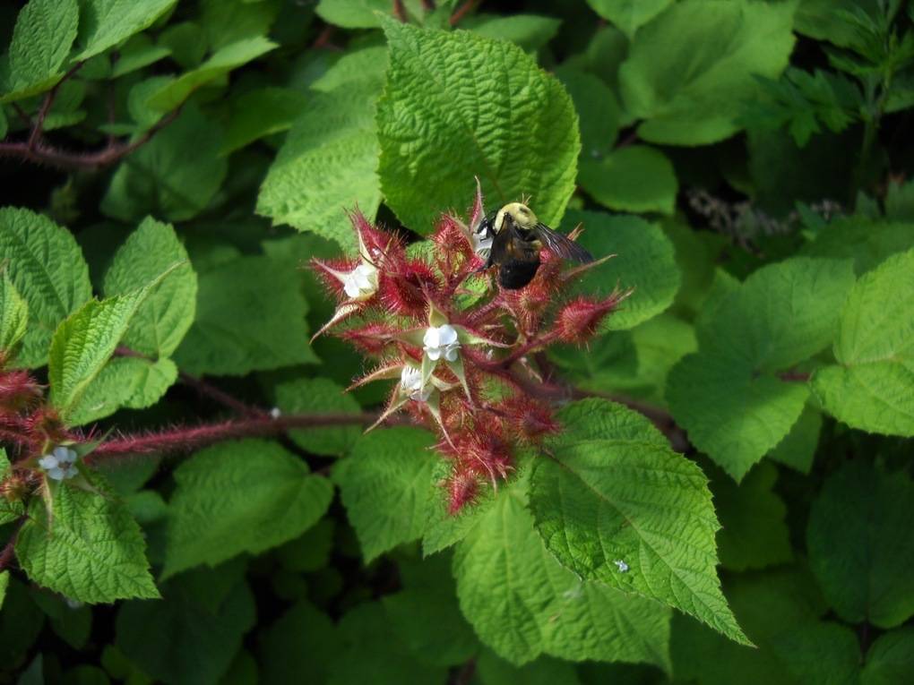 Wine raspberry has perennial underground roots that produce biennial aboveground canes, or stems. In its first year, the stem grows unbranched to its full length and will only produce leaves. In its second year, the cane sends out side shoots which produce clusters of flowers at the tip.