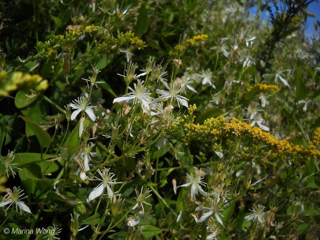 Yam-leaved virgin's-bower is native to northeastern Asia and was introduced to North America in the late 1800's as an ornamental garden plant. It produces abundant masses of fragrant white blooms in early fall that sustain flower-visiting insects when most other plants are done with flowering. It grows best in full sun and has established itself in a brushy area near the dawn redwood at Salter Grove. It also grows on Rock Island but does not do as well there because of the greater exposure to strong winds.