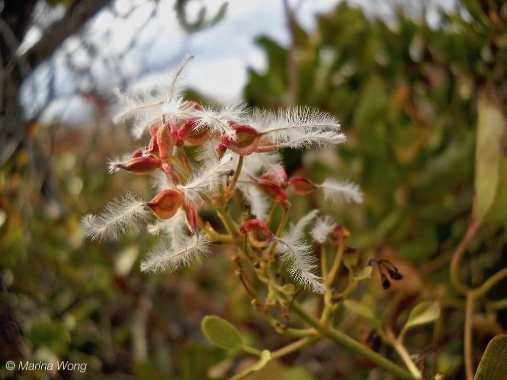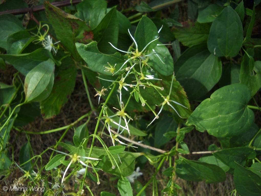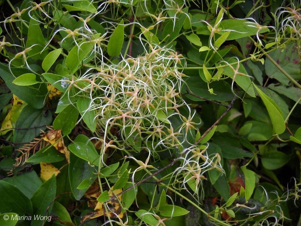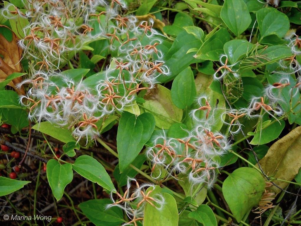 The fruits produced look quite other-worldly and certainly are not reminiscent of other fruits in the buttercup family, to which the yam-leaved virgin's-bower belong. There is a single large seed with a whip-like tail that unfurls into a feather duster as the fruit matures. Surprisingly, dispersal is by wind despite the substantial size of the seed.